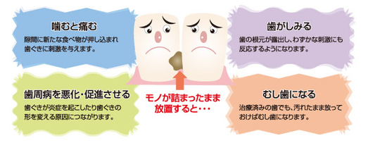歯と歯の間に物が挟まっていると、その部分から虫歯が生じやすくなります。歯と歯の隙間から歯の内部に向かって虫歯が進行しやすいため、虫歯は発見しにくいです。