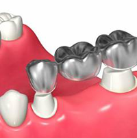 抜けた歯が1~2本くらいで、その隣に健康な歯がある場合は、その歯を利用して橋を渡すようにダミーの歯を作って咬めるようにするのがブリッジです。保険適用のために費用が安い事と治療時間が短いことがメリットです。入れ歯の様な違和感や取り外しのわずらわしさがないこともメリットです。デメリットとしては、ブリッジをするためには抜いた歯の隣の歯を削らないといけないことです。仮に隣の歯が健全であっても削る必要があります。削った部分は元には戻りませんので、大きなデメリットとなります。