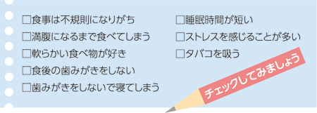 歯周病は生活習慣と深く関係しています。喫煙、ストレス、不規則な生活などの生活習慣は歯周病を悪化させる危険因子です。タバコを吸う、疲労やストレスがある、よく咬まずに食べる、間食が多い、夜ふかしが多い、そんな方は歯周病に要注意です。