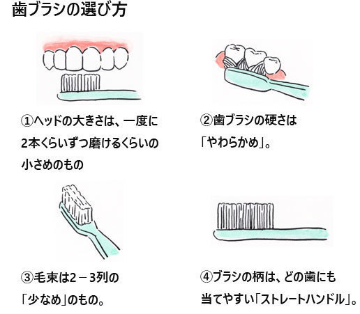 歯ブラシには、「ふつう」「やわらかめ」「かため」がありますが、一般的に「ふつう」のタイプがおすすめです。歯磨きの一番の目的である、歯垢の除去には「やわらかめ」では毛先がすべって効率が悪いからです。ただし、歯周病で出血しやすいという人は、歯肉を傷つけにくい「やわらかめ」を使って丁寧に磨きましょう。そして症状が改善したら「ふつう」の歯ブラシを使いましょう。一方「かため」の歯ブラシは、磨き方が弱めという方に向いています。