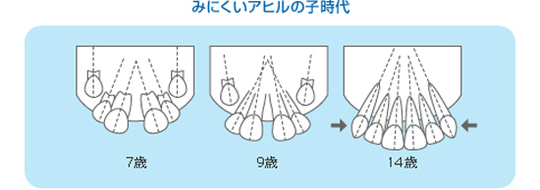 正常な発育のひとつの段階である「みにくいアヒルの子期」ですが、永久歯が生えそろう12歳前後までに自然と歯並びが整い終了します。隙間が目立つ前歯も、側切歯や犬歯などが生えてくるにつれて徐々に左右から押されて自然と隙間が目立たなくなってきます。
