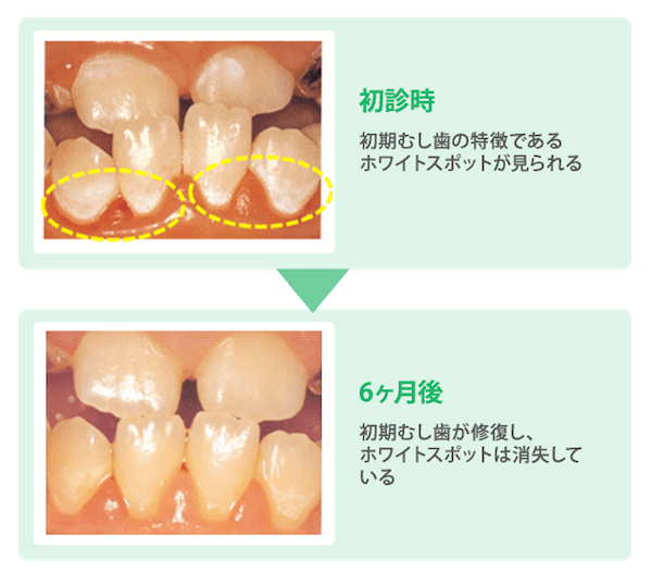 虫歯の進行をおさえる最適な方法は毎日のフッ素の使用です。フッ素は歯の表面のエナメル質と結びついて硬い層になります。初期虫歯の部分は柔らかくなっているので、毎日の低濃度のフッ素使用が初期虫歯の改善に最も効果的です。フッ素はジェルや歯磨き粉、洗口剤のタイプがあるので、自分にあった方法を行ってください。また、歯科医院で定期的な高濃度のフッ素塗布も有効です。