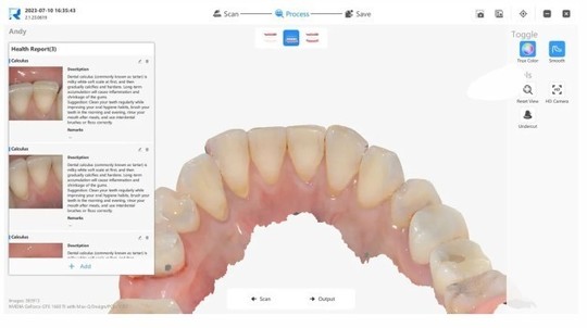 口腔内スキャンにより得られた3Dデータをもとに、虫歯の有無やその状況・歯の状態・歯石の付着状況などをAi分析し、病変の種類や治療計画などのレポートを自動で生成します。QRコードを用いた共有機能により、患者さん自身も現在の口の中の状態や今後の治療内容をスマートフォンで簡単に確認し、自宅での口腔内のメンテナンスに役立てることが可能になります。