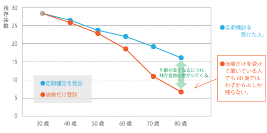 残存歯数の違いは「虫歯の治療で歯医者へ行った」のか「虫歯の予防で歯医者へ行った」のか、の違いだということが分かっています。歯を残すには、3〜6ヶ月に1度の定期的なメンテナンスを受けることが大切です。欧米では、予防歯科のためのメンテナンスに力を入れたことにより、国民の平均残存歯数が大きく向上しました。グラフのようにメンテナンスをきちんと受けた方と受けなかった方とでは80歳になったときに約9本もの差がついているのです。