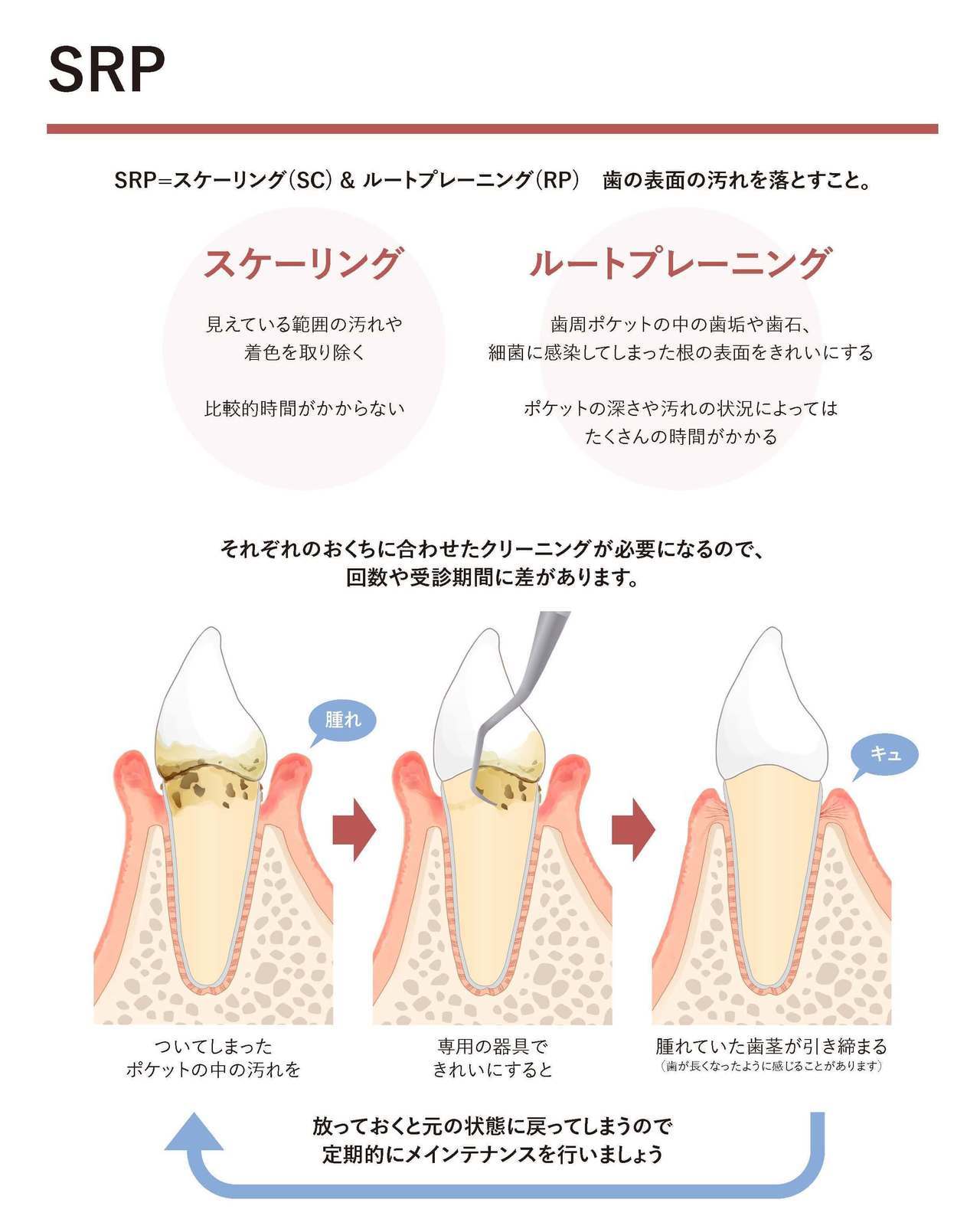 一般的な歯科医院での歯周病治療ではスケーリング(歯ぐきより上の部分の縁上歯石や歯の表面のプラークを除去する治療)のみで終了する場合も多いです。しかしながら、スケーリングだけでは歯ぐきの中の縁下歯石やプラークを除去すること出来ません。きちんとした歯周病治療のためにはSRP(スケーリング・ルートプレーニング)といって歯ブラシだけでは除去できない歯ぐきの中の歯石やプラークを除去して、歯ぐきの中や歯の根元の部分をきれいにする治療が必要になります。この治療は何回か(4回程度)かかりますが、当院では徹底して行っていきます。