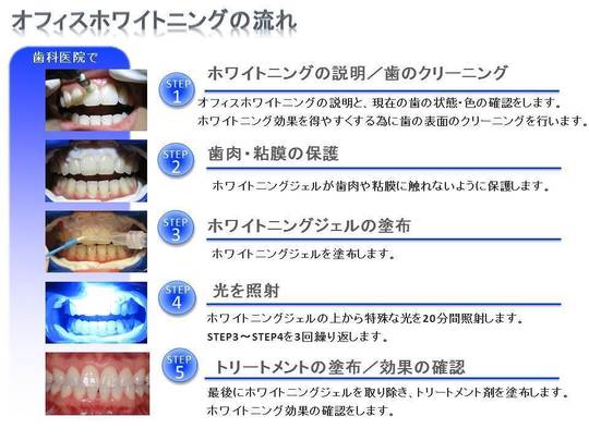 幅広い濃度の薬剤があり、フッ素と硝酸カリウム配合でしみにくい工夫がされているのが特徴です。オフィスホワイトニング並に高濃度な製品もあります。効果が出るまでは少し時間がかかりますが、後戻りがしにくく自然な白さに仕上がります。