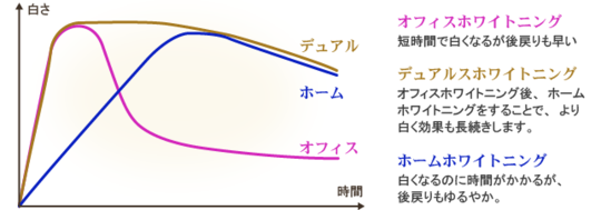 「オフィスホワイトニング」の効果の持続時間は、3ヶ月~6ヶ月と言われ、時間をかけて行う「ホームホワイトニング」の持続期間は、6ヶ月~1年と言われています。
